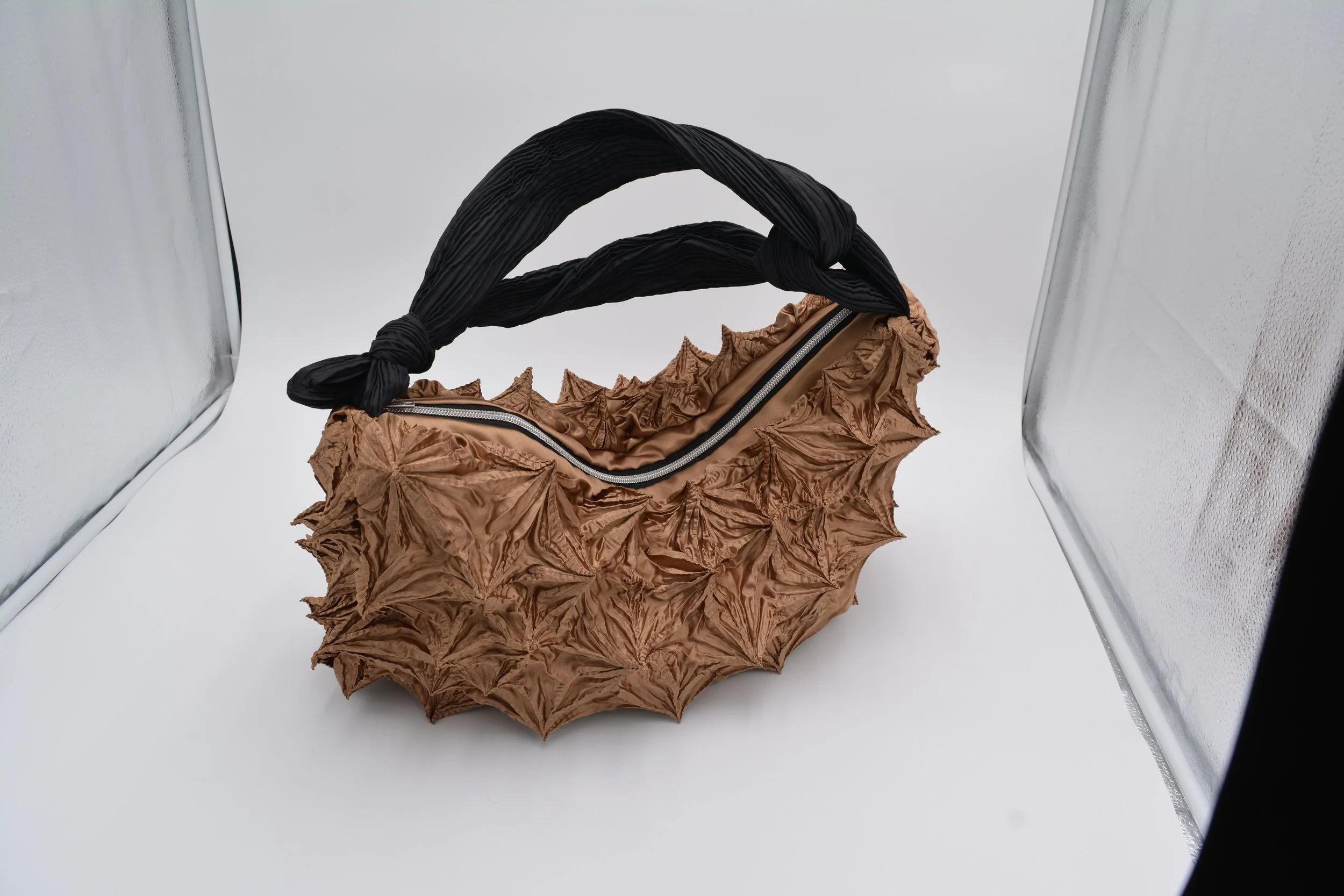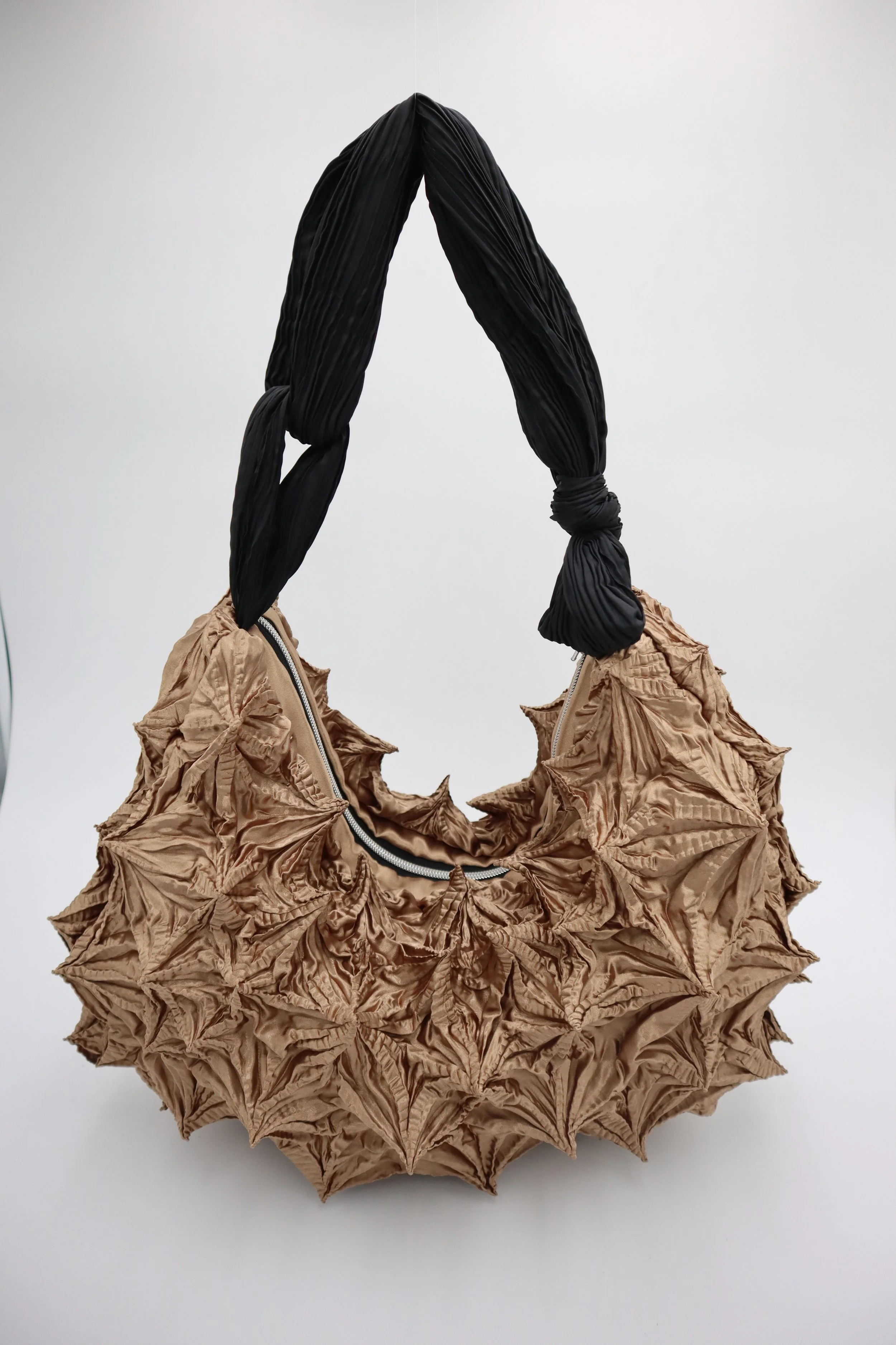 Pleated Small bag: each pleat is meticulously formed with a thread used to tie the fabric before steaming, creating permanent, unique pleats. Unlike regular machine-made pleats, these pleats are irregular, giving each bag its distinctive and unique organic character.